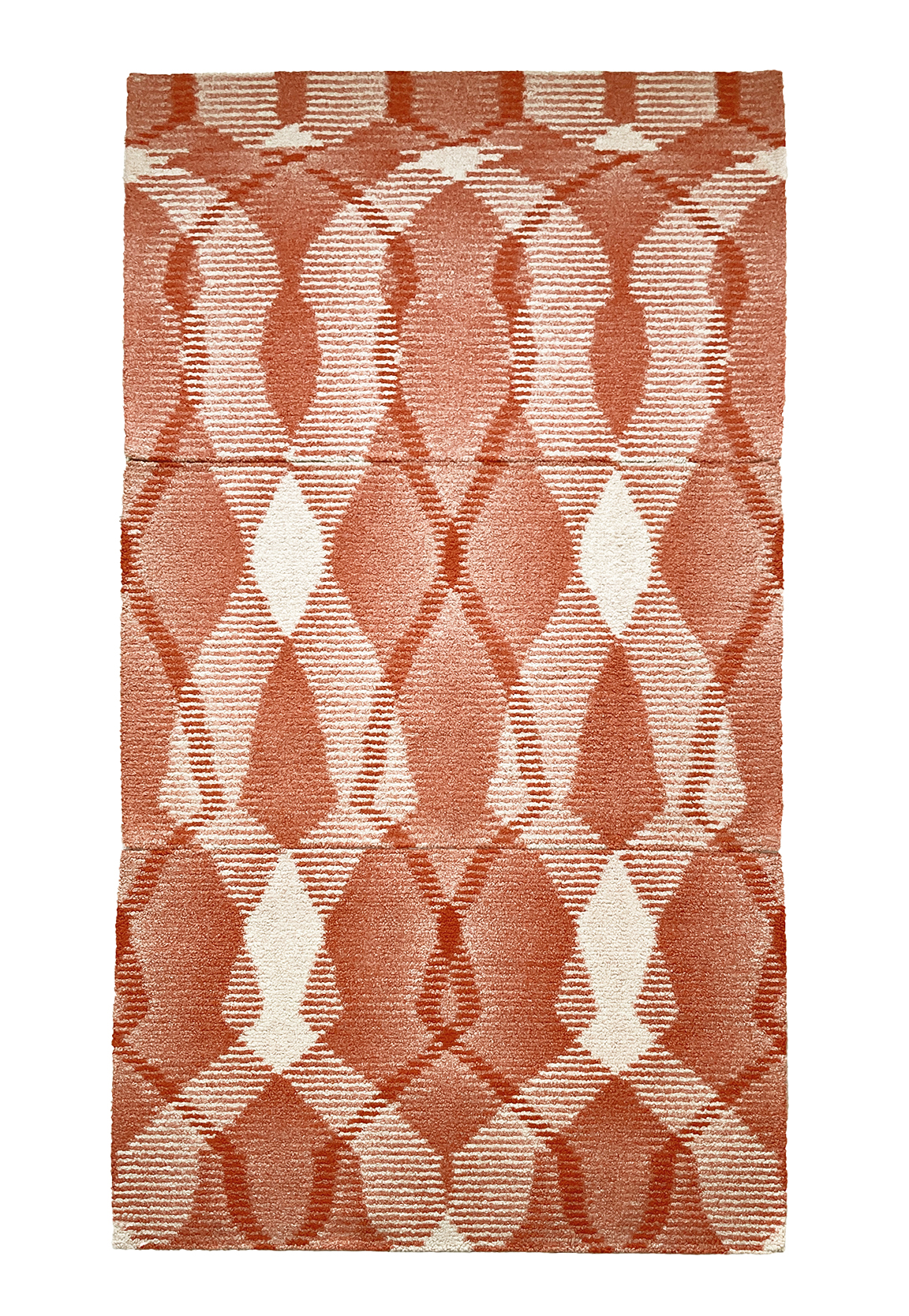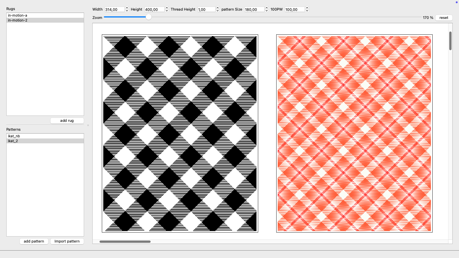 Between 2011 and 2014, Diane Steverlynck worked on the industrial development of yarns with great bi-coloured rhythms for use in creating rugs with fluctuating patterns. In the course of this project, she collaborated with Pierre Marchand to create an open-source computer program to preview the graphical phenomenon of a yarn composed of given color sequences and their use in different textile techniques, particularly large tufted formats. This research led to the production of several yarns in collaboration with textile engineer Armand Steinbach (Diese Wolle). We found out how to “disrupt” the spinning machine’s existing settings in order to obtain new graphic possibilities. The yarn with its repetitive motif was then, in turn, “disrupted” during the making of the carpets, thus creating infinite variations from the preview designs we had generated with the computer program.