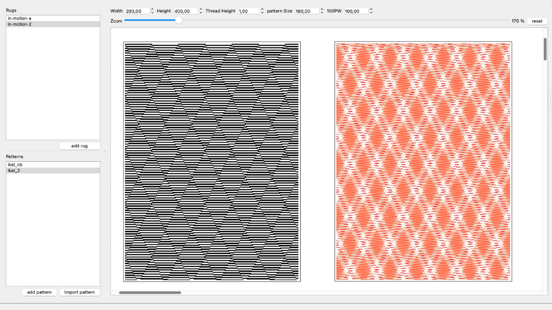 Between 2011 and 2014, Diane Steverlynck worked on the industrial development of yarns with great bi-coloured rhythms for use in creating rugs with fluctuating patterns. In the course of this project, she collaborated with Pierre Marchand to create an open-source computer program to preview the graphical phenomenon of a yarn composed of given color sequences and their use in different textile techniques, particularly large tufted formats. This research led to the production of several yarns in collaboration with textile engineer Armand Steinbach (Diese Wolle). We found out how to “disrupt” the spinning machine’s existing settings in order to obtain new graphic possibilities. The yarn with its repetitive motif was then, in turn, “disrupted” during the making of the carpets, thus creating infinite variations from the preview designs we had generated with the computer program.