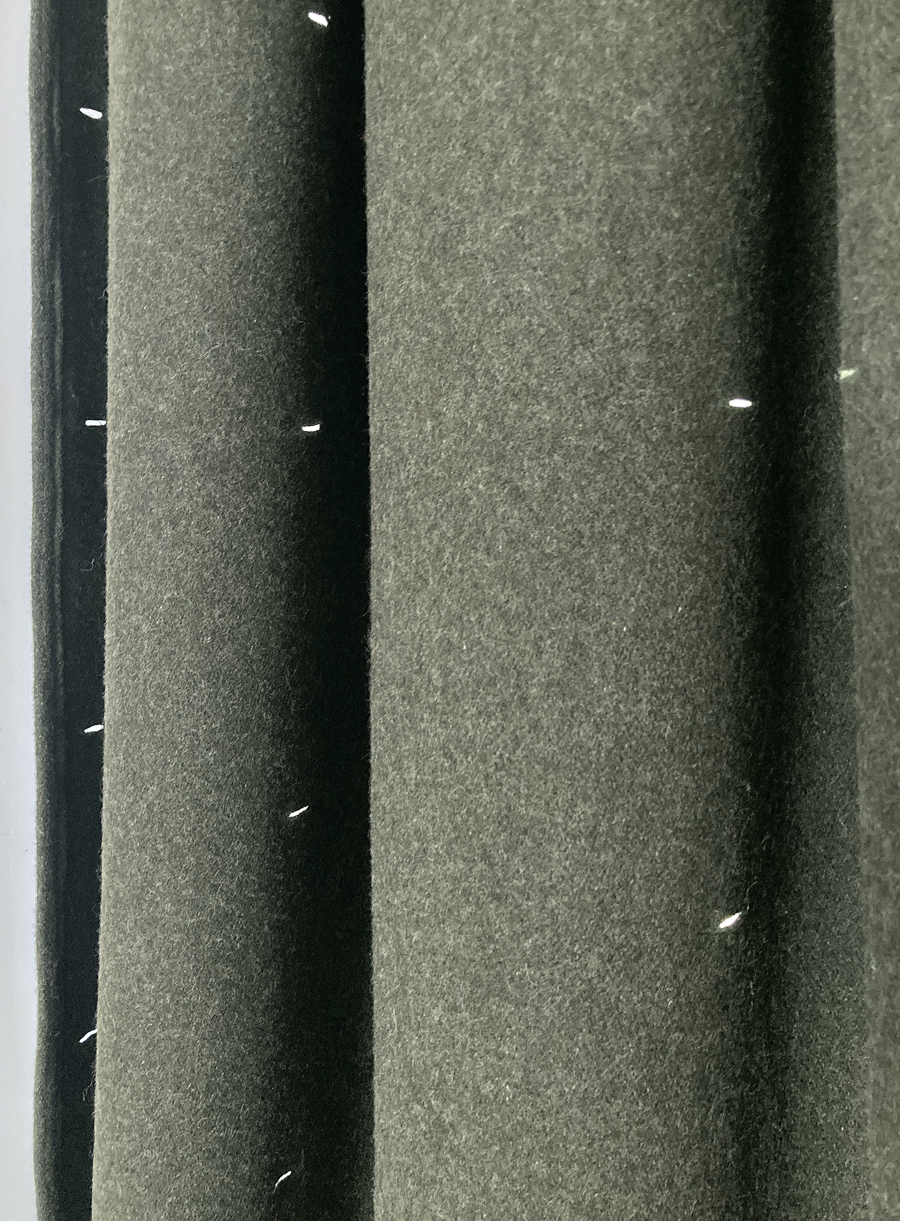 The layers of fabric are here ‘liberated’ and the stitches are replaced by the perforation of multiple buttonholes. The layers are complemented by matching double buttons. These buttons play, as multiple points of independent sewing.