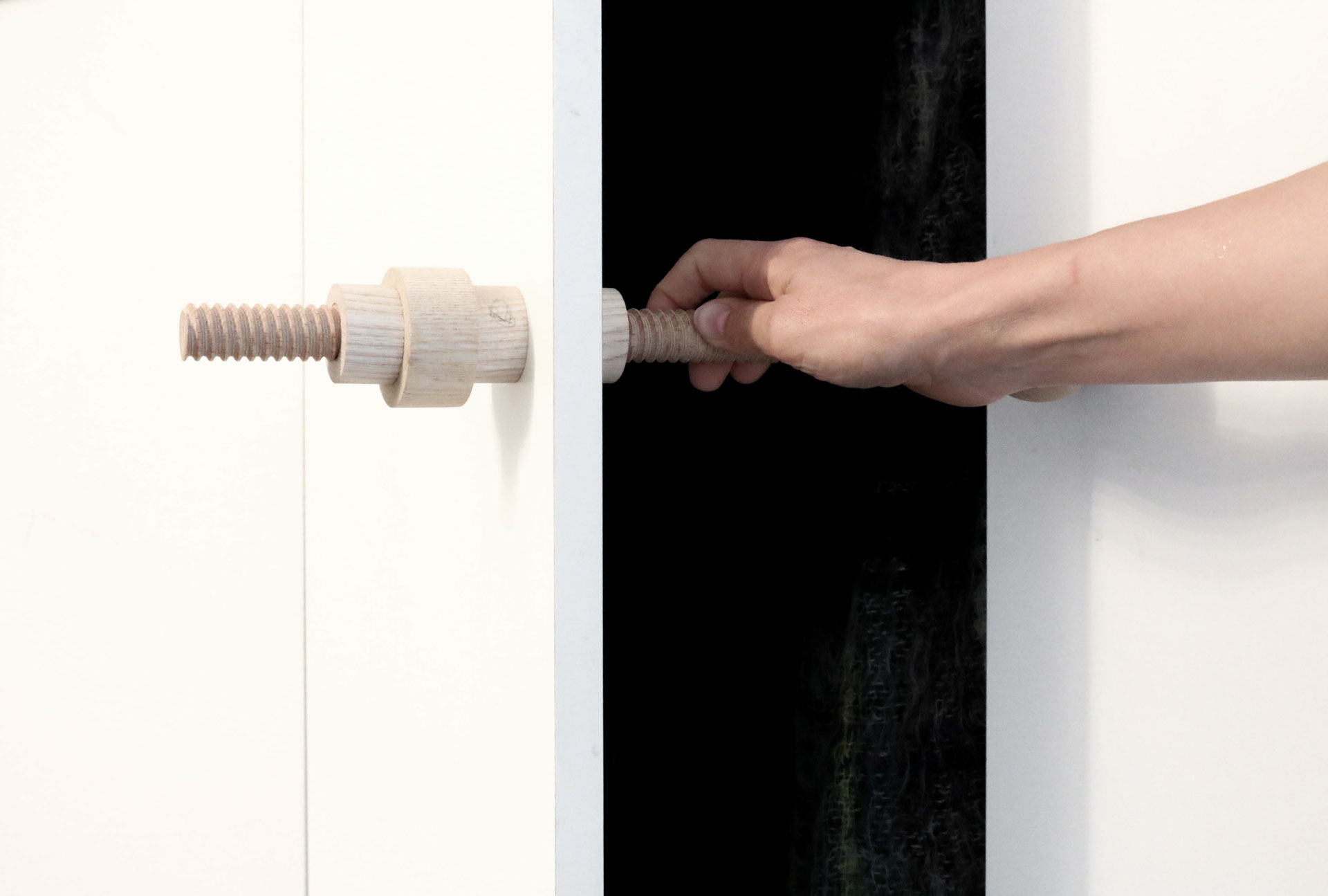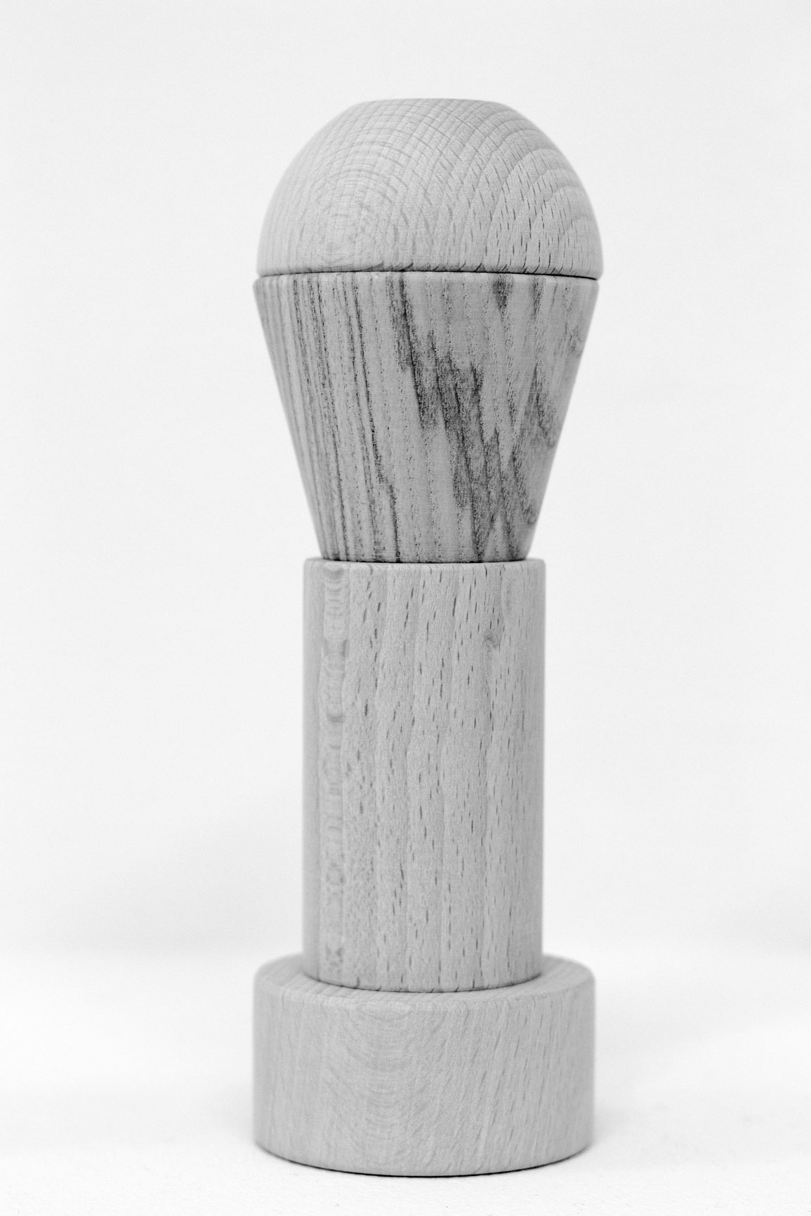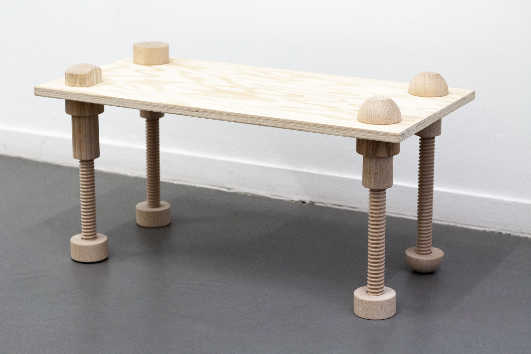 The wood-screw parts stem from further reflection on modular systems and their reductive spirit that aims at the highest employability with a minimum number of parts. Observing these principles of modularity and grid in relation to the designs and uses they produce, we learned that just like modularity led us to the idea of efficiency, the grid drives us to reflect its uniform, repetitive and practical nature. This awareness incited us to create parts that have a playful potential, unsystematic patterns and sensory value. Produced by woodturning, the parts reflect the variability of shapes and typology of daily object generated by this technique.