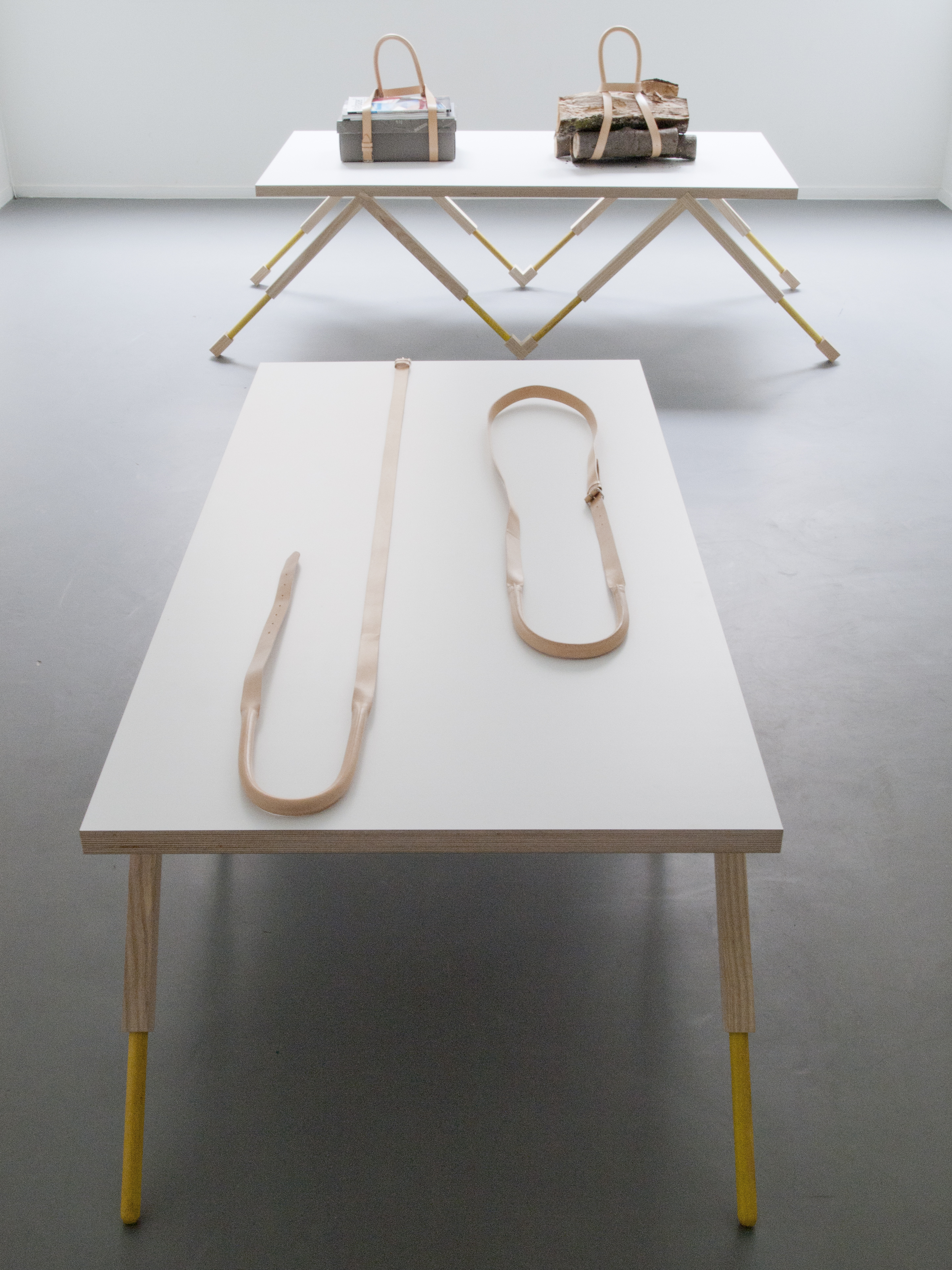 A handle that extends into a strap, provided at its end with an adaptable belt buckle. A tribute to the action of transporting, this simple device allows many typologies. The element "handle" draws and determines the use and comfort of the object.