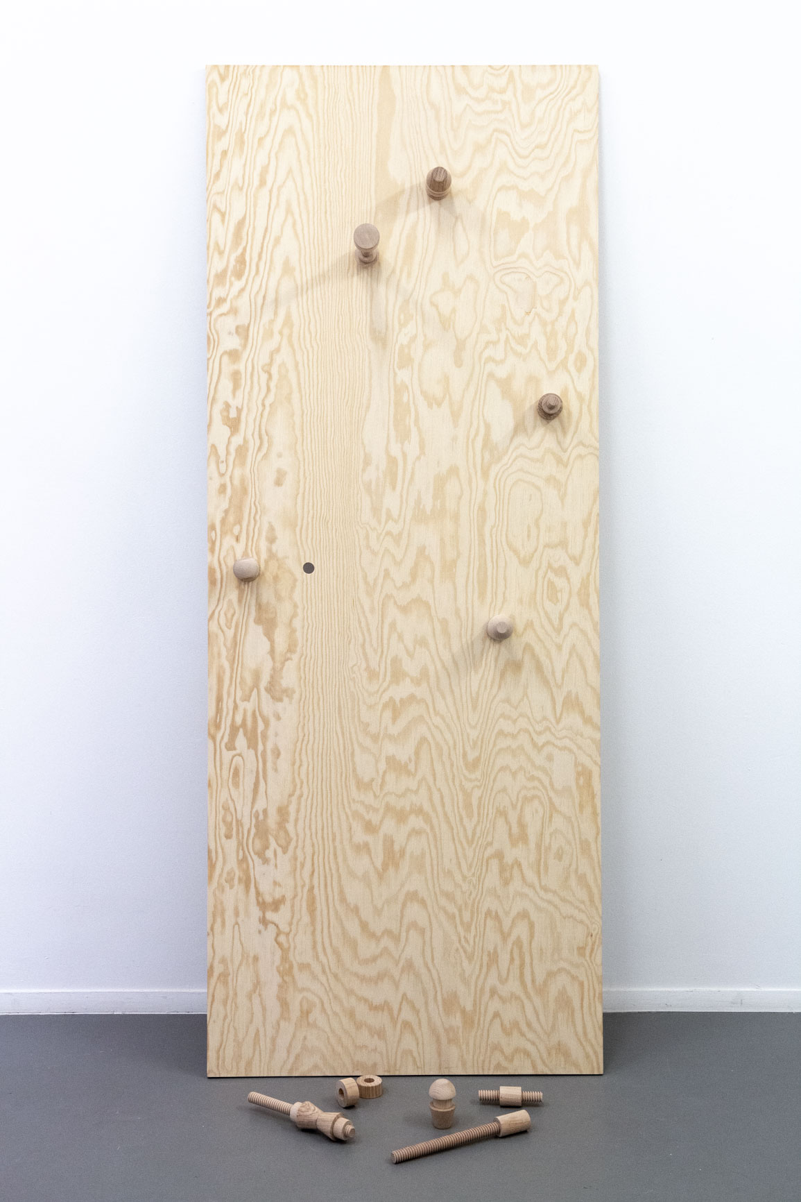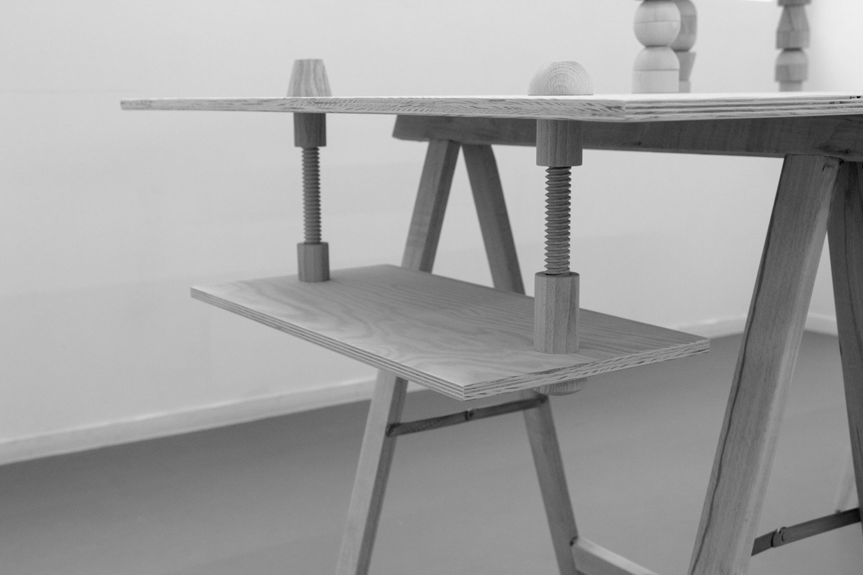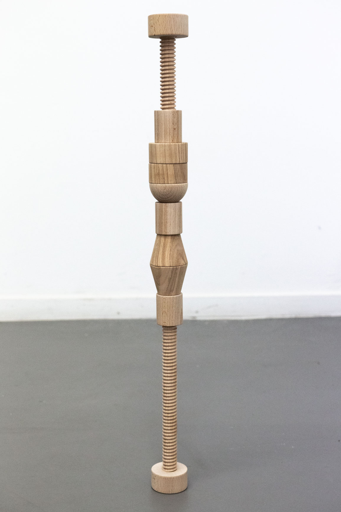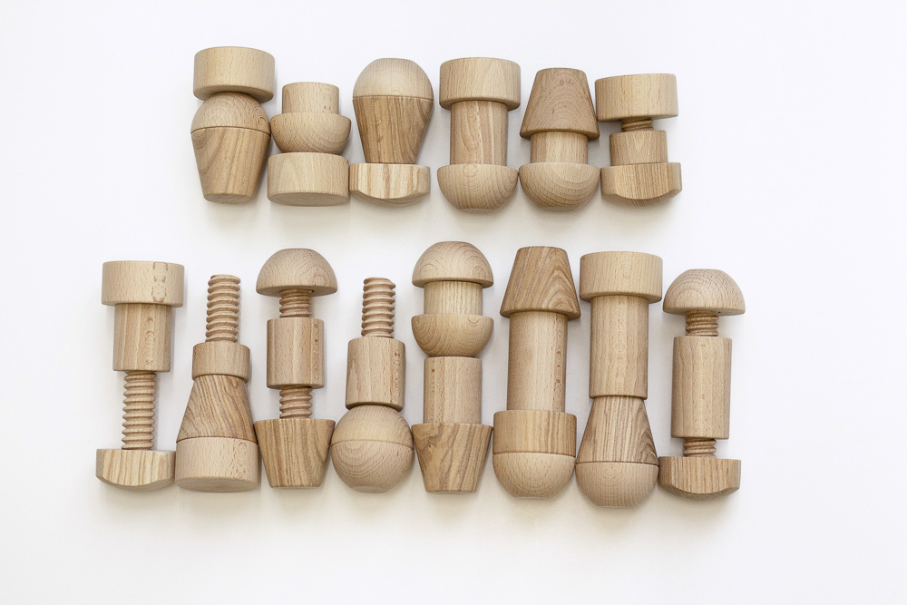 The wood-screw parts stem from further reflection on modular systems and their reductive spirit that aims at the highest employability with a minimum number of parts. Observing these principles of modularity and grid in relation to the designs and uses they produce, we learned that just like modularity led us to the idea of efficiency, the grid drives us to reflect its uniform, repetitive and practical nature. This awareness incited us to create parts that have a playful potential, unsystematic patterns and sensory value. Produced by woodturning, the parts reflect the variability of shapes and typology of daily object generated by this technique.